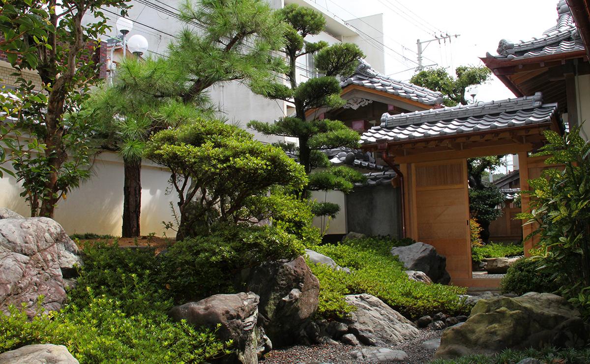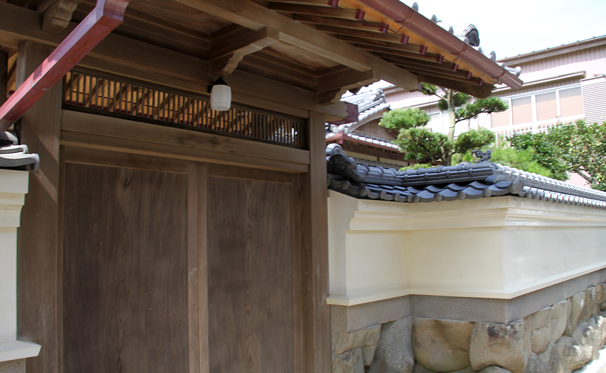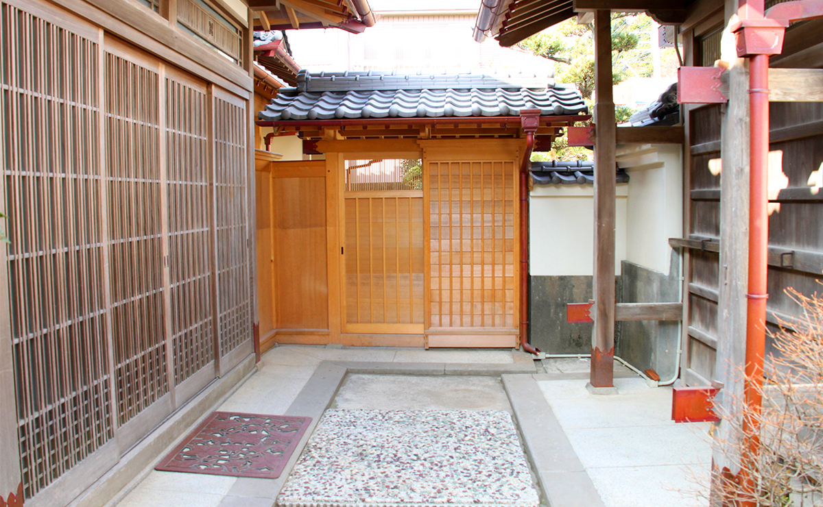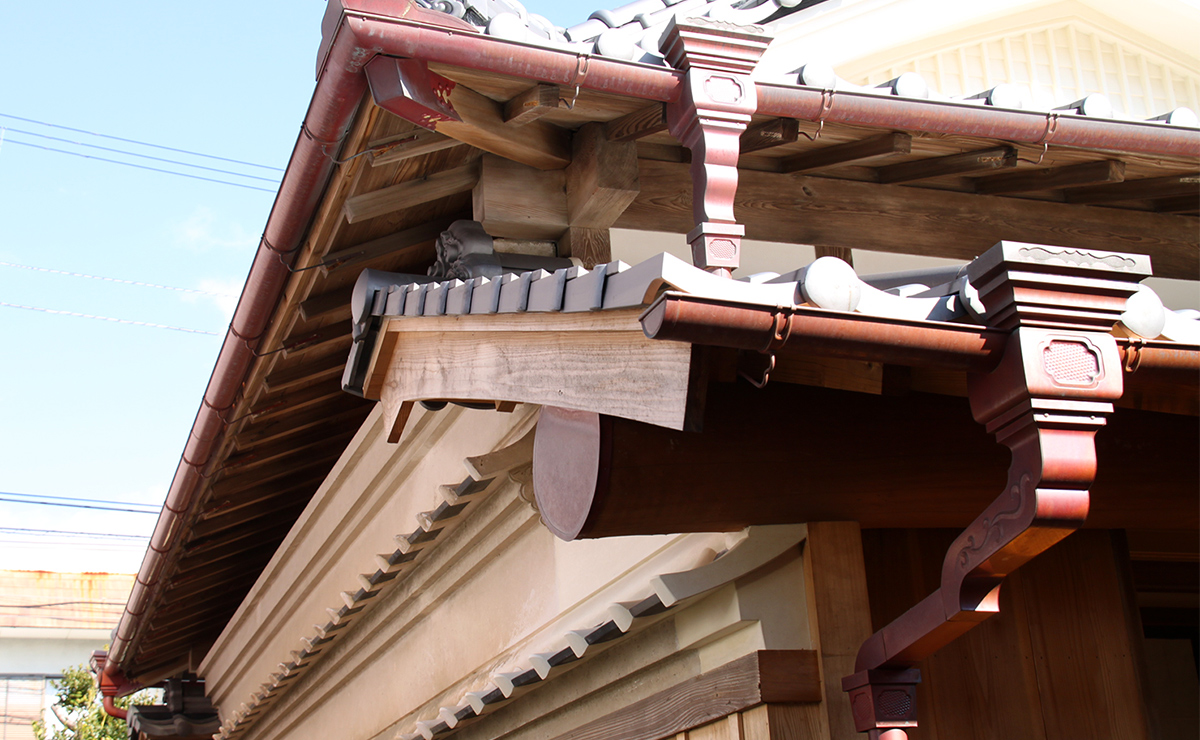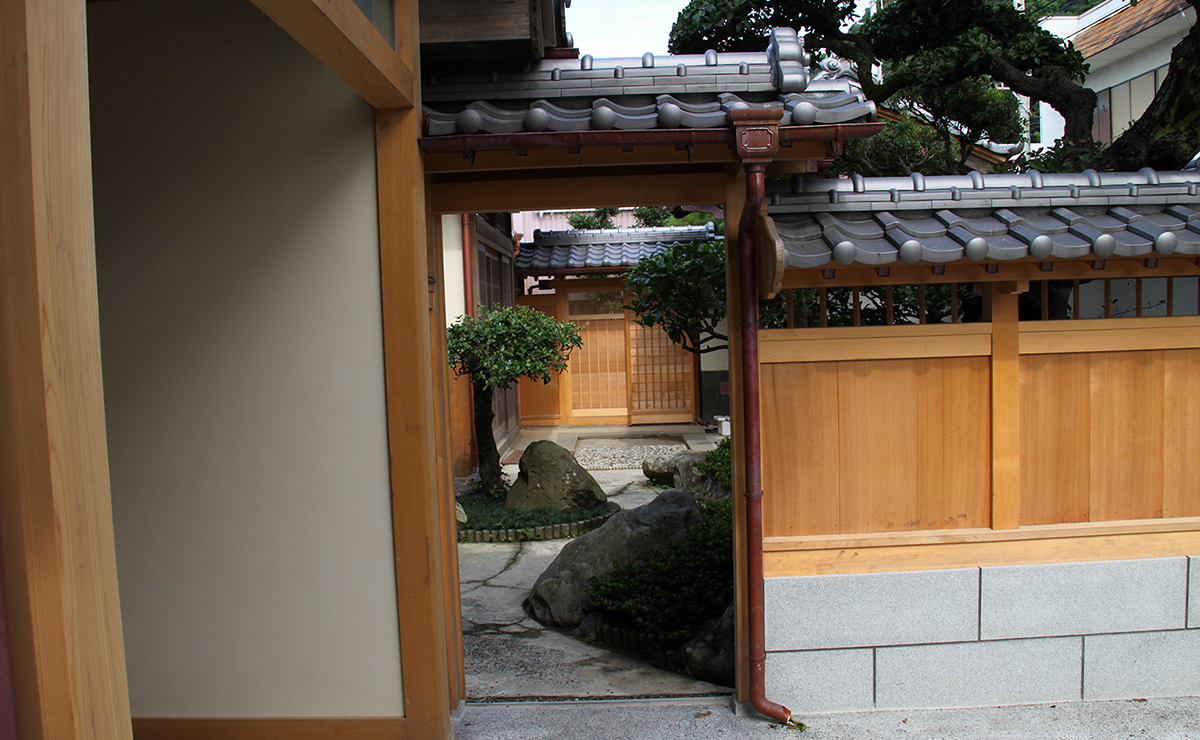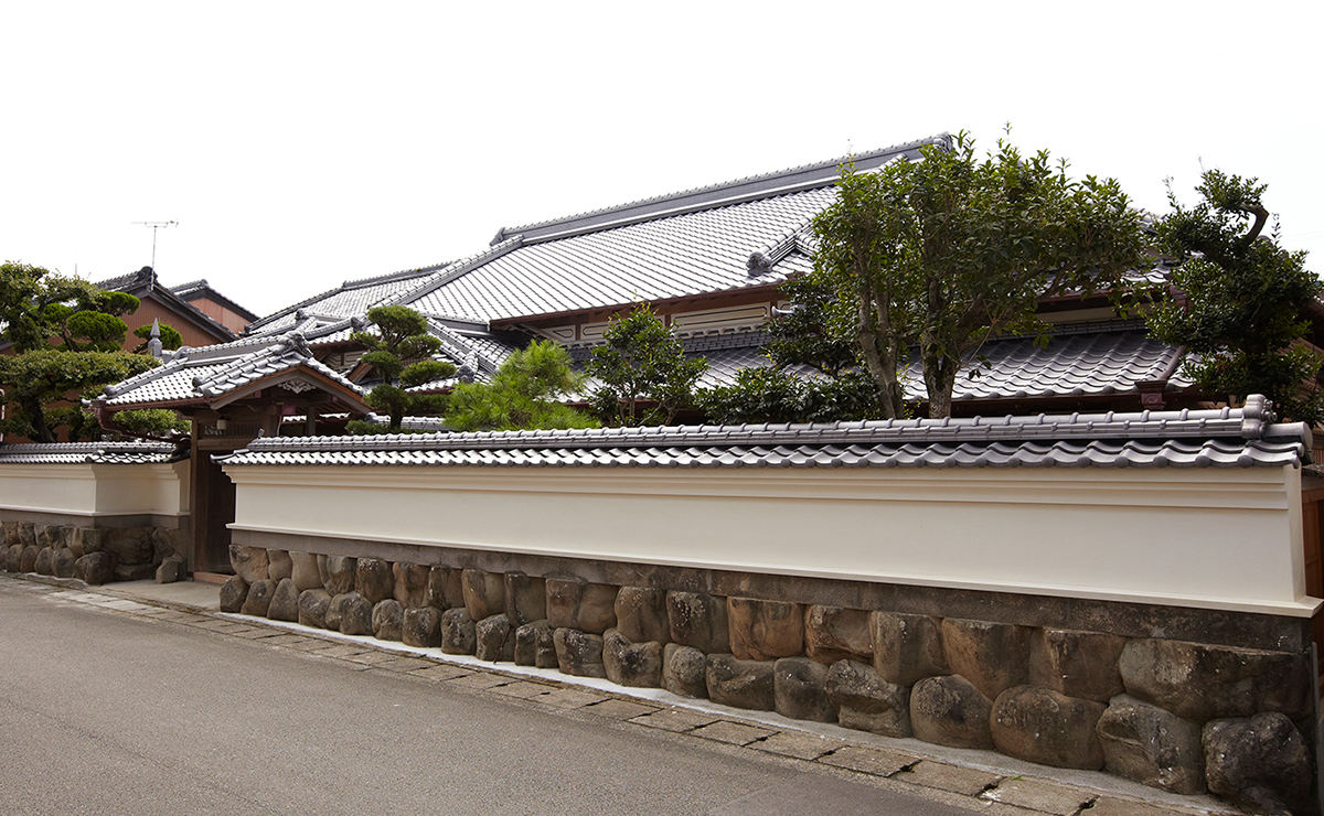 建物は、入母家造・平屋建・瓦葺で、8室からなっています。 隈は、石組の上に土佐漆喰の土塀が約17mに渡って廻らされ、また、建物にも多くの水切りなどが施されています。士佐漆喰は高知で古くから使われてきた壁素材のひとっで、耐熱性、耐久性に優れ、水にも強く、きめの細やかな士佐漆喰でできた壁は、台風の通り道である高知県にとても適した墜素材です。 門は、 「表門」、 「東門」、 「 中門」が設けられています。表門は、ケヤキの1枚板を使用し、建築当時は、「表門だけで家l軒が建つ」と言われたそうです。