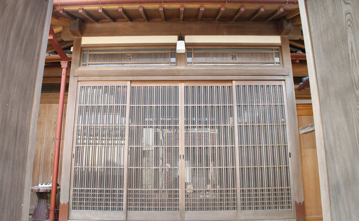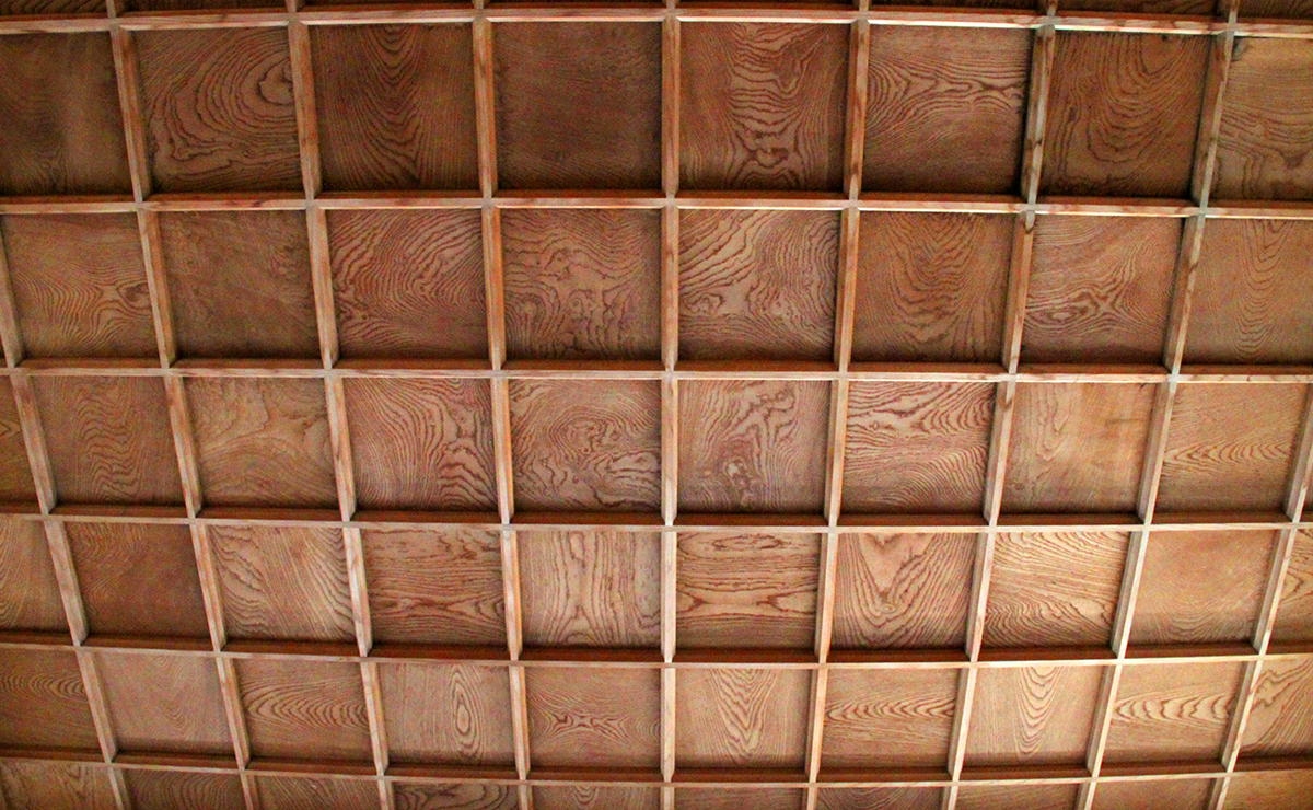 天井はケヤキの角材の格縁を格子に組んで裏板を張った格天井となっています。修復前は、雨漏りがひどく、改修後も天井や左右の腰板にその痕跡が残っています。