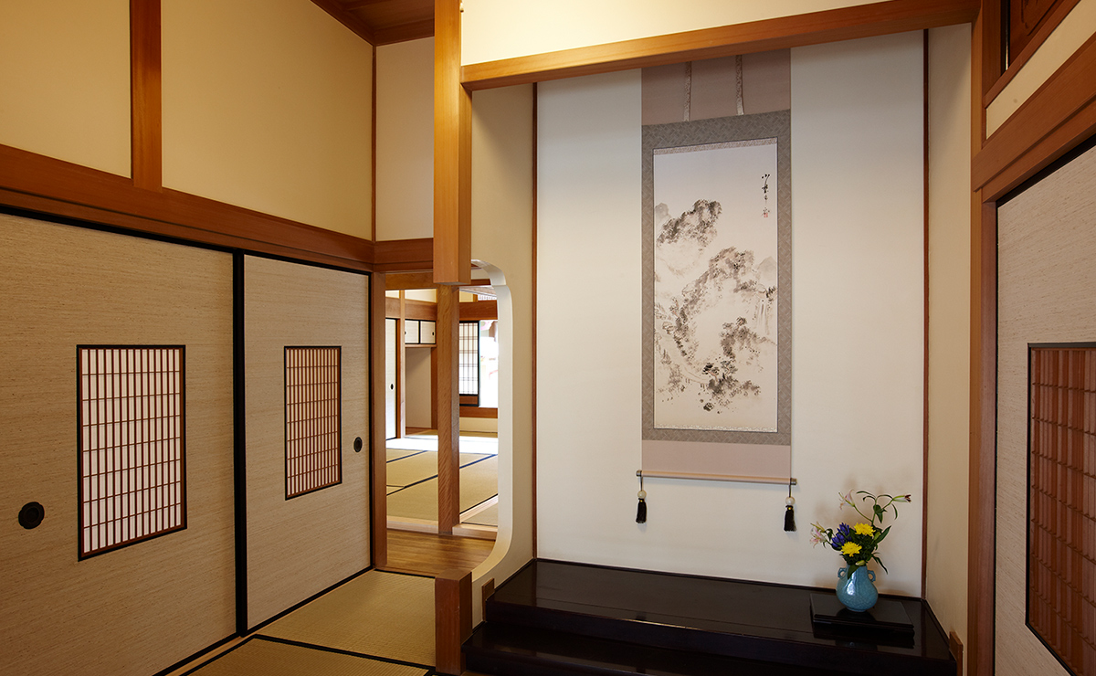 上質な意匠をこらした格子組みのガラス戸を開けると、広々とした玄関があり、正面に釣床を設け、武家屋敷を連想させます。