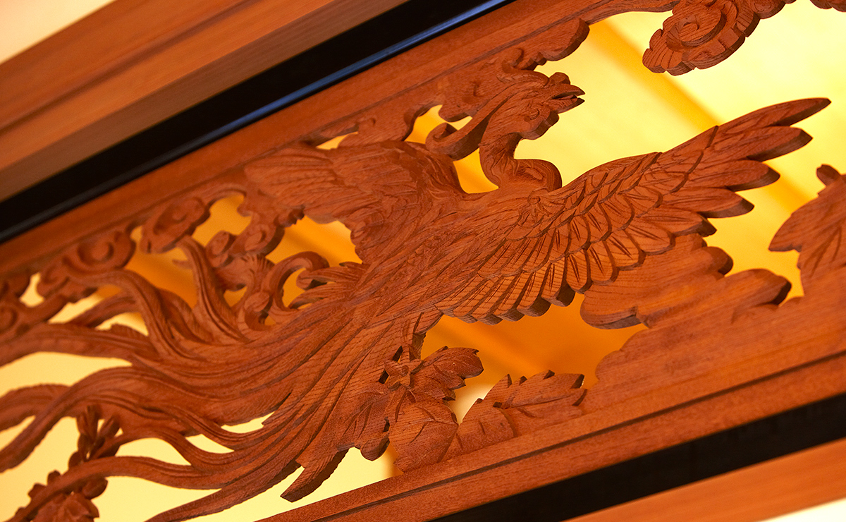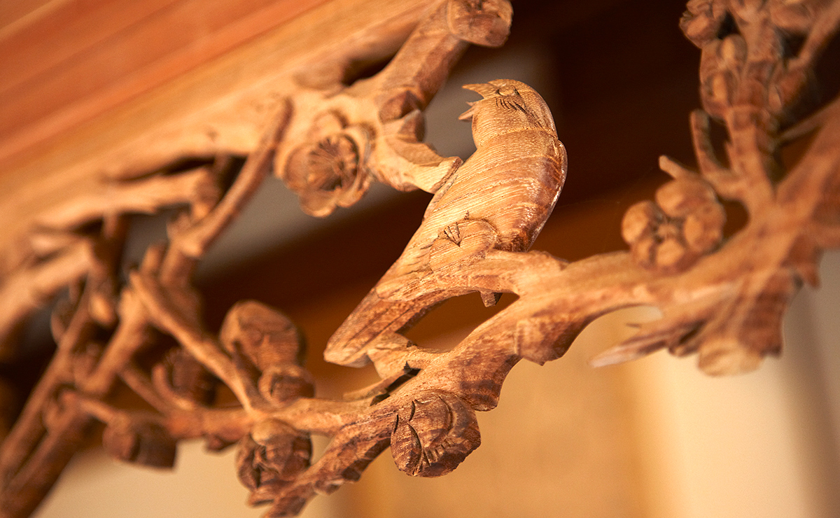 和紙④、⑤は棹縁天井を張り、天井長押を廻して格調高い空間とし、また、床の間と床脇の間や書院の上部にも欄間をはめ込むなど、障子や襖とともに上質な意匠となっています。